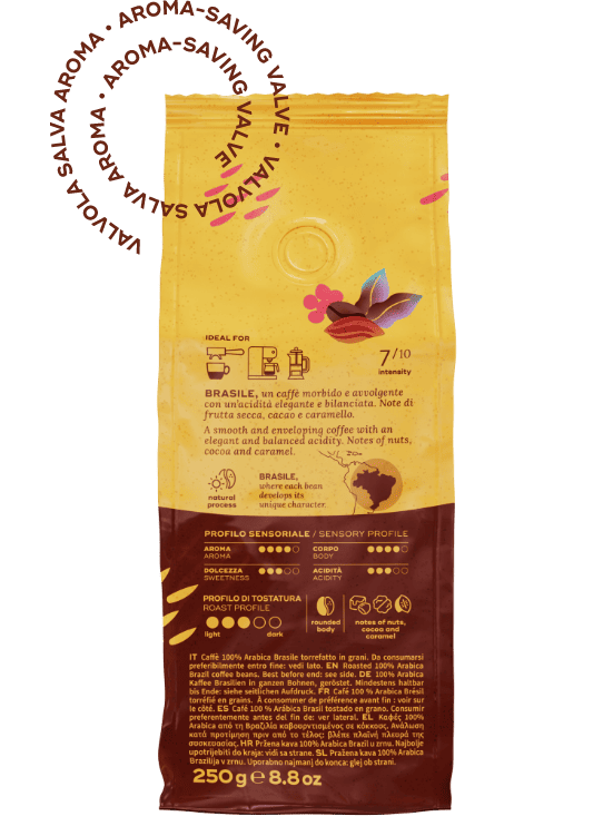 Hausbrandt Brasile nasce dalla volontà di raccontare il caffè partendo da un solo luogo, lasciando che sia il territorio a parlare. Un 100% Arabica Morbido e Avvolgente, caratterizzato da un’acidità fine e bilanciata e da un profilo aromatico che richiama la dolcezza della frutta secca, le Sfumature del cacao e le note calde del caramello. Ogni sorso risulta rotondo e familiare, pensato per una degustazione autentica e consapevole, capace di valorizzare le sfumature e il carattere della sua origine.